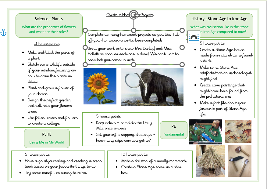 Optional homework is provided every half term to earn some extra house points! Work can be brought into school or submitted on Google Classroom.